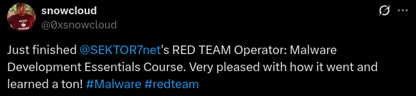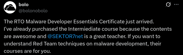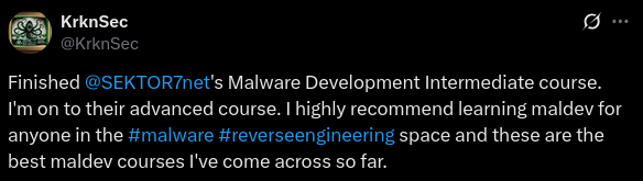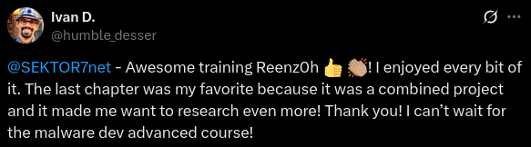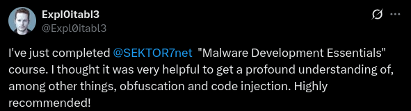 We have courses on Malware Development (aka Offensive Coding), from essential principles to advanced techniques for both user-land and kernel-level exploitation.